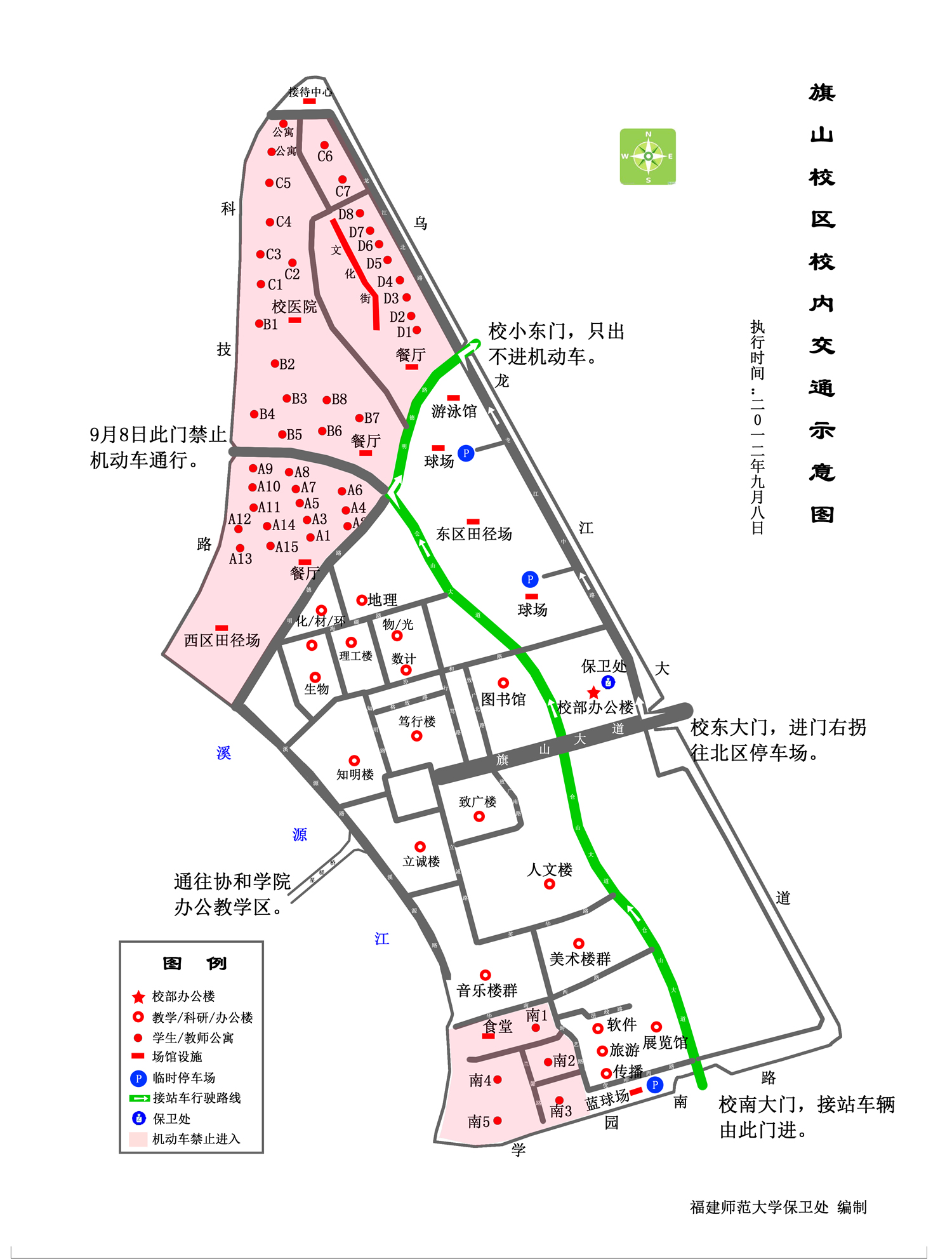3、因校园(尤其是仓山校区)停车场地有限,为减少因车辆过多造成交通拥堵给您带来不便,建议住在学校附近的本校教职员工尽量不在9月8日开车进校,尽量不将机动车辆停在校内;建议新生家长尽可能不带车入校。