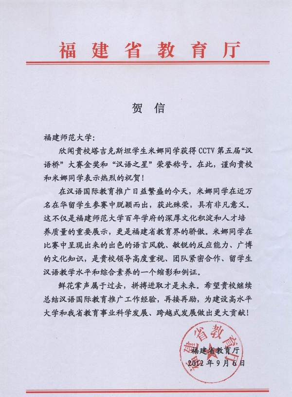 福建省教育厅致信祝贺球友会平台(中国)米娜同学获得第五届“汉语桥”大赛金奖