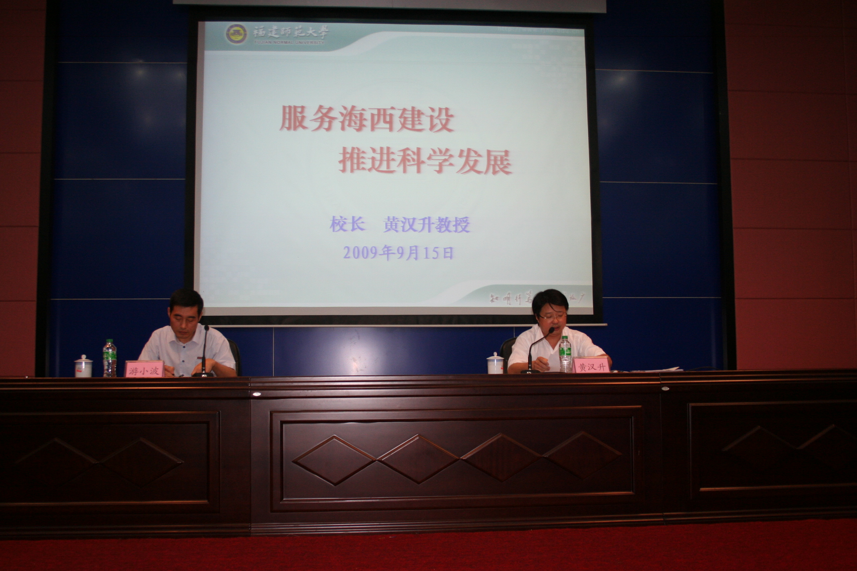 黄汉升校长代表校党委、校行政作了题为《服务海西建设,推进科学发展》的报告。报告分为两个部分,第一部分以“九个三”,高度概括了上学期学校各项工作所取得的显著成绩。黄汉升指出,领导干部敢为人先的闯劲和魄力,是学校取得各项成绩的关键;各单位执行力的增强,是各项工作卓有成效的保障;各学院创造性开展工作,是学校实现跨越式发展的根本。学校的每一点进步、每一点突破、每一点收获,都离不开全体教职员工的同心同德、艰苦奋斗,都凝聚了历代师大人和全校师生员工的辛勤劳动和智慧。