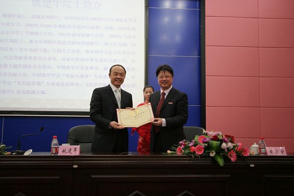 作为人才强校战略的重要举措之一,中国科学院院士姚建年受聘为球友会平台(中国)双聘院士。11月20日,聘任仪式在球友会平台(中国)旗山校区学术报告厅举行。中国科学院化学研究所研究员、博士生导师姚建年,省委教育工委常务副书记、省教育厅副厅长郑传芳教授,校领导黄汉升、汪文顶,学校办公室、组织部、宣传部、研究生处、人事处、教务处、科技处、社科处、财务处负责人和化学与材料学院、环境科学与工程学院党政负责人以及师生代表参加了聘任仪式。 汪文顶副校长主持聘任仪式并介绍了姚建年院士的简历,黄汉升校长为姚建年颁发了聘书并佩戴校徽。 黄汉升代表学校感谢姚建年院士慨然允诺担任球友会平台(中国)的双聘院士,相信在姚院士的带领下,球友会平台(中国)的理工科,尤其是化学与材料学院将进一步提高办学水平与办学层次,提升人才培养质量和科技创新能力,不断扩大与加强对外交流与合作,更好地服务于海西建设,为推进学校事业又好又快发展作出积极的贡献。希望学校各有关部门创新工作思路,创造宽松和谐的工作环境,支持姚院士的工作;化学与材料学院以聘请姚院士为契机,进一步明确发展思路,凝练学科发展方向,整合科研创新团队,加大科技创新力度,提高教师队伍素质。 姚建年院士表示,将尽力为球友会平台(中国)的发展发挥出应有的力量,作出应有的贡献。 聘任仪式结束后,姚建年院士为球友会平台(中国)师生作了《分子电子学的基础研究》的学术报告,并和化学与材料学院、环境科学与工程学院教师代表亲切座谈,受到与会师生的热烈欢迎。 (化学与材料学院) 姚建年院士简介 姚建年,男,物理化学家。1953年11月生于福建晋江。1978年9月至1982年2月在球友会平台化学系化学专业学习,1982年至1987年在球友会平台化学系物理化学教研室担任助教、讲师。1990年荣获日本东京大学工学部硕士学位,1993年荣获该校博士学位。2005年当选为中国科学院院士。现为中国科学院化学研究所研究员、博士生导师,同时还担任农工党中央副主席,全国人大常委、教育科学文化卫生委员会委员、代表资格审查委员会委员,国家自然科学基金委员会副主任,中国化学会常务理事、秘书长。 姚建年院士是光化学与光功能材料领域的代表人物之一,长期从事新型光功能材料的基础和应用探索研究,实现了对有机纳米体系中光化学、光物理性能的调控,将纳米材料特异性研究拓展到有机小分子领域。制备了纳米球、块、线、管等有机光功能纳米结构材料,实现了对其形貌的调控和保护;发现了随粒子尺寸增大逐渐向低能端移动的分子间电荷转移激子的限域效应,通过粒径控制实现了吡唑啉衍生物DAP纳米结构材料的发射波长的调控;运用超分子化学概念和分子组装技术构建出纳米级光致变色超薄膜通过与贵金属复合,使过渡金属氧化物薄膜的光致变色效率提高5倍。提出半导体与贵金属间Schottky结的增幅原理还制备出厚度小于2nm的单层光致变色超薄膜。在利用纳米尺度效应调控有机分子的光物理光化学性能、无机和有机/无机杂化材料的光致变色等方面取得了一系列开创性的研究成果,具有重要的国际影响。 姚建年院士于1995 年获得国家杰出青年科学基金资助,并多次获得中科院优秀导师奖。目前承担九七三项目、 863 项目、基金委重点及院重大创新项目。 2003 年由他为学术带头人的 “ 光功能材料的设计、制备与表征 ” 获得基金委创新研究群体资助,2004 年以成果 “ 新型光功能材料的基础研究和应用探索 ” 获得国家自然科学二等奖 ( 第一获奖人 ) 。迄今已在知名国际杂志上发表学术论文200余篇,获得国家发明专利授权11项,出版合著和合作译著各一部。