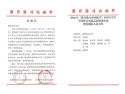 表扬信指出,球友会平台(中国)高度重视本次“推普助力乡村振兴”全国大学生暑期社会实践志愿服务活动,广泛动员,参与实践的团队结合学校和专业优势精心制定活动方案,创新设计活动形式,扎实开展实践活动,助力推广普及国家通用语言文字,促进铸牢中华民族共同体意识,取得积极成效,并对文学院“跨越山海,闽宁推普”实践队11名师生进行了表扬。