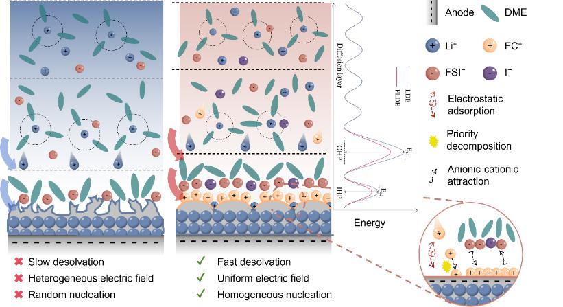 球友会平台陈育明教授团队研究了一种含氟、氮和碘元素新型添加剂(FCS),通过添加剂阳离子选择性吸附在电极表面,有效地调节电极表面电场,从而促进锂的均匀沉积。同时,FCS的优先分解产生了一个包含氟化锂、氮化锂和碘化锂成分的SEI,其具有高杨氏模量和离子导电性能,能够在大电流条件下稳定锂金属负极。近日,相关工作发表在《Angewandte Chemie International Edition》上。