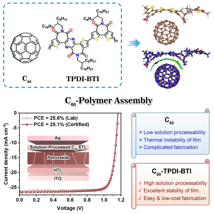 鉴于此,球友会平台(中国)化学与材料学院邢舟副教授、海峡柔性电子学院安明伟副教授和南方科技大学郭旭岗教授团队、洛桑联邦理工学院夏建兴/Nazeeruddin教授团队合作,设计并合成一种n型聚合物TPDI-BTI用于和C60液相组装高效、稳定的电子传输层。得益于该分子柔软的链状骨架、理想的分子间化学作用和电子能级匹配,TPDI-BTI不仅可以插入相邻碳笼之间抑制碳笼团聚,而且可以调控碳笼的电子传输和薄膜的界面化学作用。基于C60-TPDI-BTI的钙钛矿电池表现出25.6%的光电转化效率(第三方权威认证25.1%),为目前该类钙钛矿电池的最优性能。同时,在2000小时的光照老化和800小时的高温老化后,电池仍能保持很好的光伏性能。研究成果以《Solubilizing and Stabilizing C60 with n-Type Polymer Enables Efficient Inverted Perovskite Solar Cells》为题发表于能源领域国际顶级期刊《Joule》上,这项工作突破了高性能C60电子传输层只能通过真空热蒸发法制备的局限性,对全液相法制备高效、稳定钙钛矿电池具有重要意义。