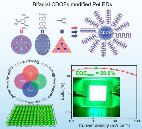 针对上述挑战,球友会平台(中国)陈大钦教授课题组开发了多功能碳点有机框架(CDOFs)作为钙钛矿层的双界面修饰材料。该策略通过同步钝化上下界面,使薄膜光致发光量子产率提升至接近100%,并实现28.0%的外量子效率。CDOFs修饰层还显著优化了电荷平衡注入特性,将器件开启电压降低至1.9V。值得一提的是,CDOFs优异的缺陷钝化能力使器件在10000 cd/m2初始超高亮度下的T50工作寿命延长至81.7分钟,且未观察到明显焦耳热效应。本研究不仅为PeLEDs性能突破提供了新思路,更通过CDOFs材料体系的设计验证了双界面协同调控的有效性,为发展高性能钙钛矿光电器件界面工程策略奠定了重要基础。