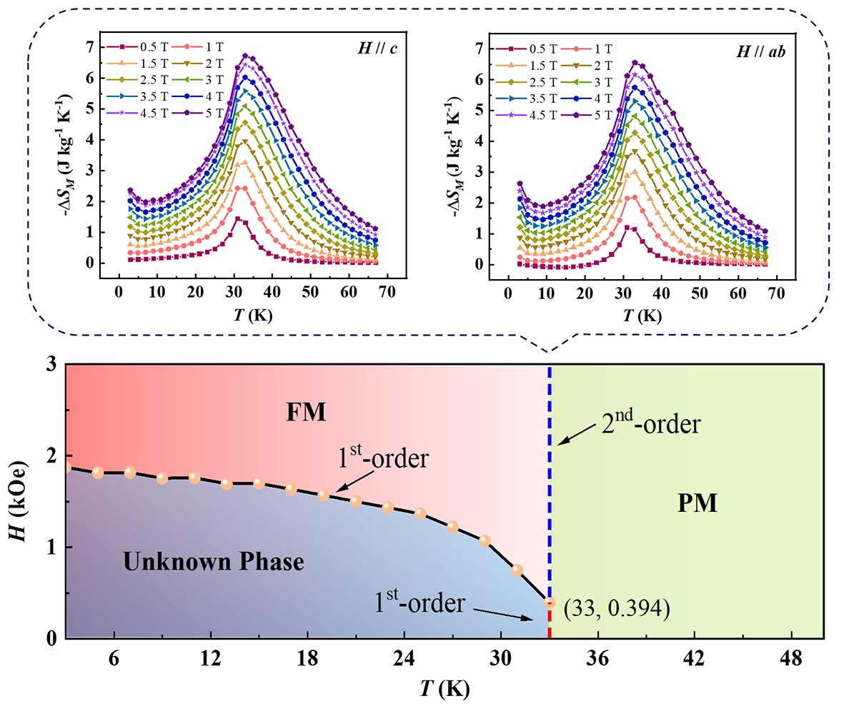 球友会平台(中国)物理与能源学院林中冲副教授、黄志高教授团队联合北京大学杨金波教授团队,通过生长高质量二维铁磁晶体CrBr3,系统研究了它在磁转变温度附近的临界行为,确定了其临界指数(β = 0.245(3), γ = 1.010(6), δ = 5.207(2));在磁转变温度以下观察到一阶相变特征,并构建了CrBr3的磁场-温度磁相图;在三临界点附近体现出显著的各向异性磁热效应:沿着面外/面内方向施加5 T外场时,CrBr3最大磁熵变为6.72/6.55 J·kg-1·K-1,相对冷却功率可以达到137.51/133.46 J·kg-1,显示出大的各向异性磁热效应。