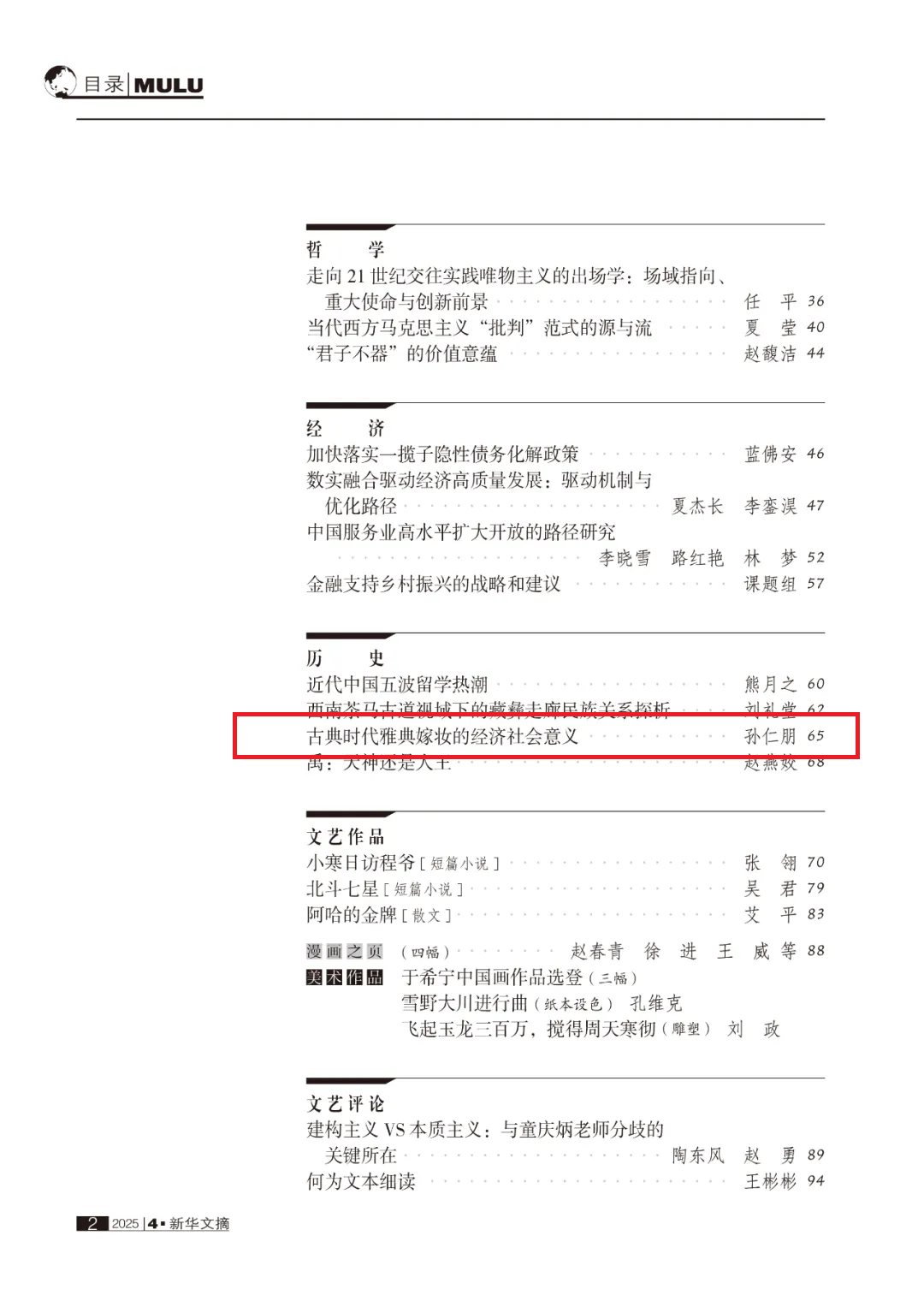 日前,球友会平台(中国)社会历史学院孙仁朋老师发表在《经济社会史评论》2024年第4期的学术论文《古典时代雅典嫁妆的经济社会意义》,被《新华文摘》2025年第4期转载,字数6400字。