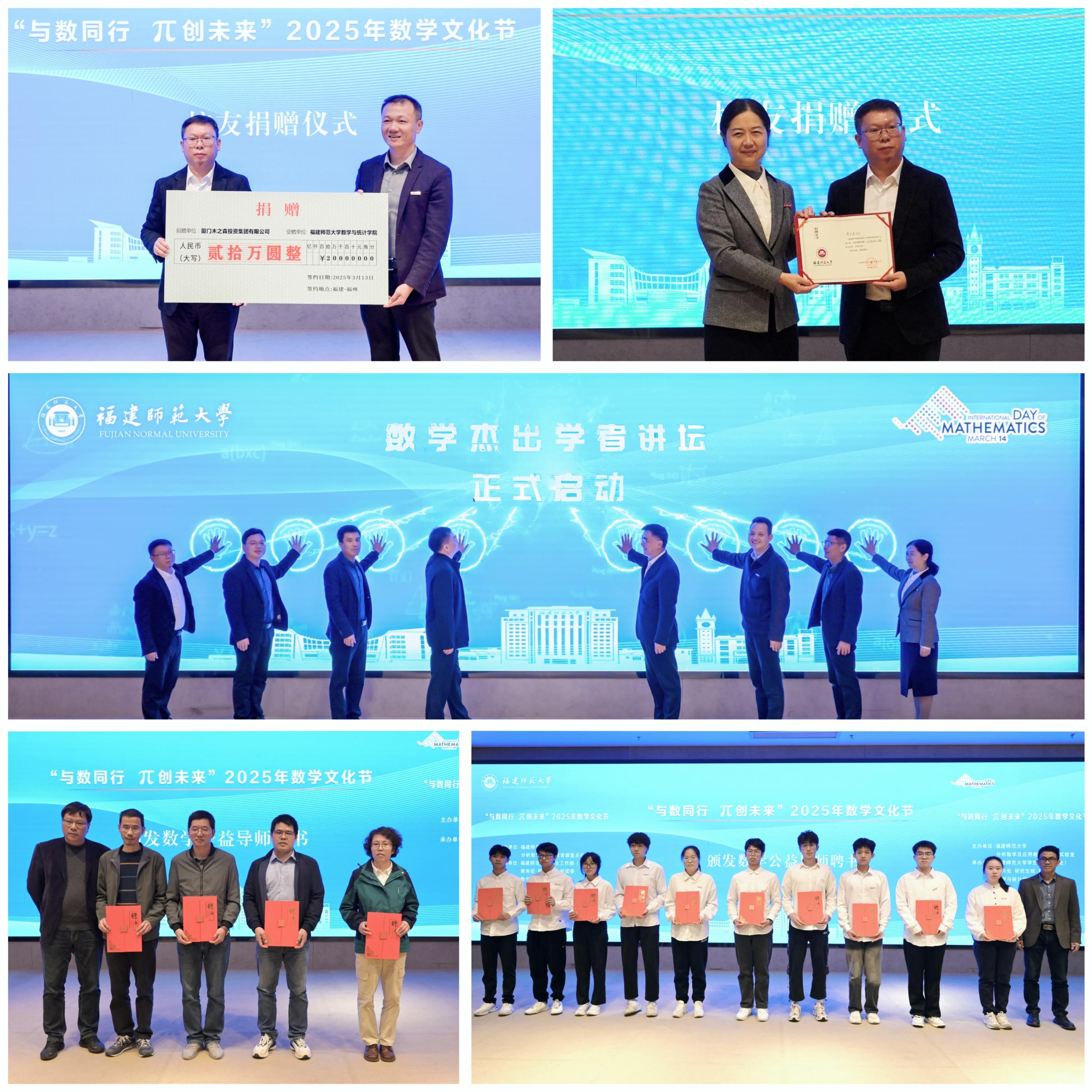 随后,与会领导、嘉宾共同启动数学杰出学者讲坛。廖木森向数学与统计学院捐赠人民币20万元,支持学院的建设与发展。球友会平台(中国)数学与统计学院相关负责人为5名“数学公益导师”、10名“朋辈导师”颁发聘书。