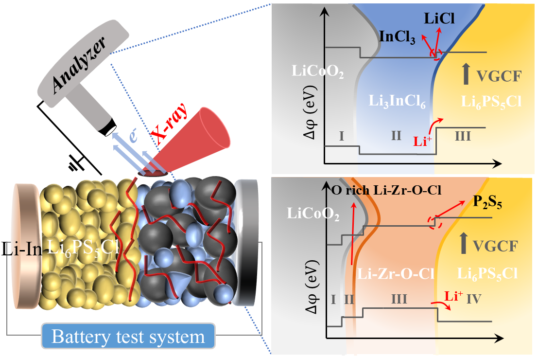 针对上述挑战,球友会平台(中国)林应斌教授团队在前期研发工况X射线光电子能谱技术的基础上,系统研究了硫化物与氯(氧)化物(Li3InCl6/Li1.75ZrO0.5Cl4.75)组合电解质的界面稳定性及离子传输行为,揭示了Li3InCl6因界面静电势差阻碍锂离子迁移并在电子渗透下不可逆分解为InCl3/LiCl的失效机制,以及Li1.75ZrO0.5Cl4.75通过氧富集界面形成和低势差促进离子扩散实现稳定循环的关键规律。