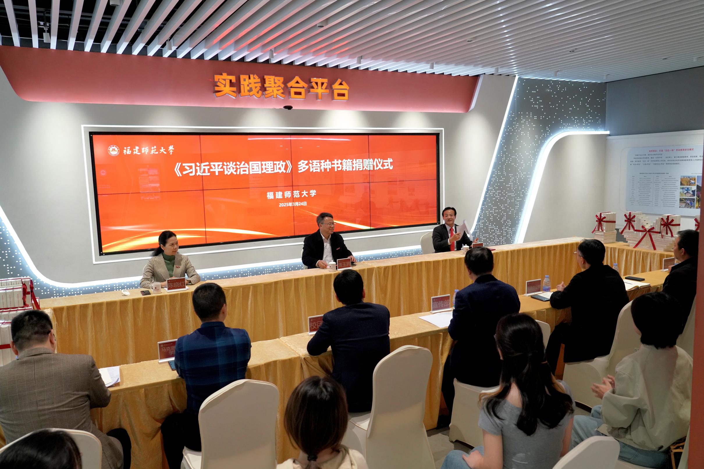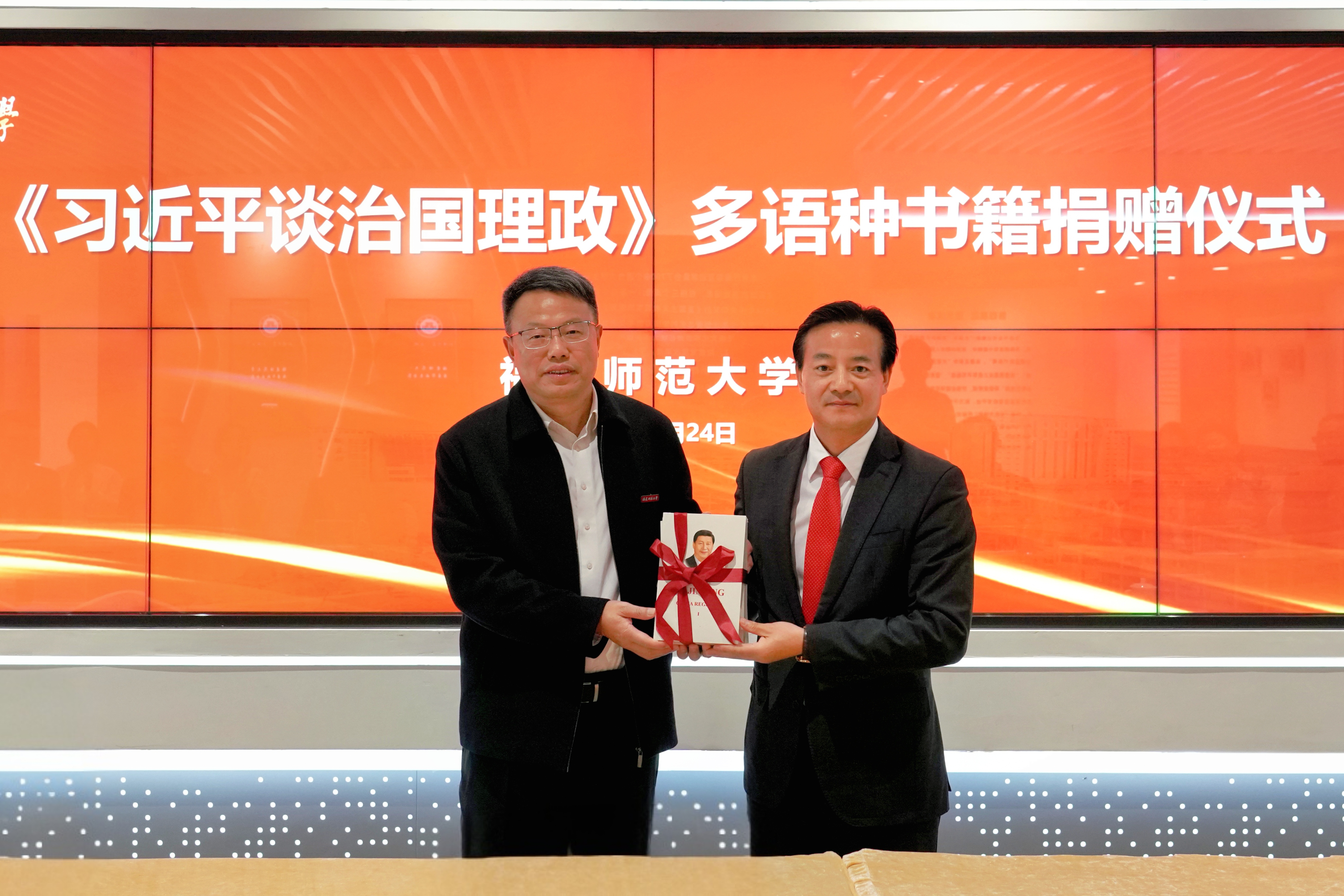 潘玉腾代表学校向捐赠单位表示诚挚感谢。他指出,《习近平谈治国理政》系列书籍,是习近平总书记执政理念和智慧的深刻体现,是马克思主义中国化时代化的重大理论创新成果。学校人文底蕴深厚,具有学习、研究和传播马克思主义理论的优良传统和坚实基础,今后将用好这批《习近平谈治国理政》多语种赠书,推动理论学习更系统更深入,研究阐释更加体系化学理化,理论宣传普及更有说服力感染力,为建设社会主义文化强国贡献师大力量。希望双方以次赠书活动为契机,进一步加强交流与合作,共同讲好中国故事,传播好中国文化。
