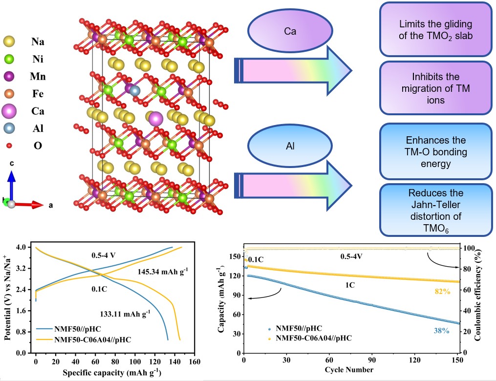 因此洪振生课题组通过创新结构设计,成功制备出Fe含量高达0.5的高性能富铁正极材料,其在2.0-4.0 V工作区间内实现143.28 mA h g-1的优异比容量,并通过协同优化策略使循环稳定性达到传统低铁材料水平。性能突破源自双重优化机制:钠层中引入的Ca元素通过“支柱效应”有效抑制TMO2层间滑移和过渡金属离子迁移;同时Al掺杂显著增强TM(3d*)-O(2p) 轨道杂化强度,在缓解晶格畸变的同时阻断了有害相变过程。全电池测试数据显示,优化后的富铁正极在150次循环后仍保有82%的初始容量,相比较未改性材料(38%)提升显著。该成果不仅刷新了高铁含量正极的性能极限,更通过明晰的机理解析为开发兼具低成本与高性能的钠电体系开辟了创新路径。研究成果以“Fe-rich layered oxide cathode for sodium-ion batteries enabled by synergistic modulation of ion transport and structural stability”为题发表于国际知名学术期刊《Energy Storage Materials》。