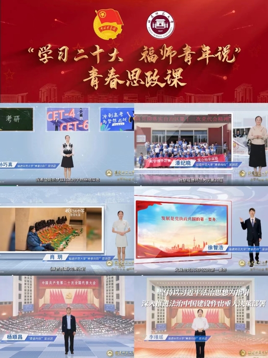 校团委整合了青年讲师团、博士生宣讲团、青马宣讲团等力量,成立了“青春向阳”宣讲团,推出以“学习二十大福师青年说”为主题的青春思政课。宣讲团围绕党的二十大报告中“新时代十年的伟大变革”,共拍摄了14期宣讲微视频,并将于近期在小葵新媒体矩阵平台陆续推出,组织全校团支部开展专题学习。