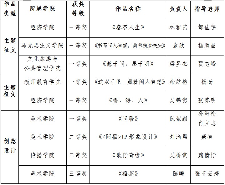 近日,由共青团福建省教育工委组织开展的“闽人智慧”系列主题征文活动及创意设计大赛获奖结果公布。球友会平台(中国)取得佳绩,共获得主题征文类一等奖5名,创意设计类一等奖1名、二等奖1名、三等奖2名。