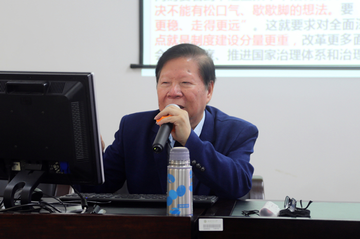 郑又贤教授以《开辟“中国之治”新境界》宣讲题目,从党的十九届四中全会的国内外反响及其学习宣传的基本要求引入,提出要从四个视角来学习把握党的十九届四中全会精神。宣讲着重分析了党的十九届四中全会的基本概况及重要意义、我国国家制度和国家治理体系具有13个方面的显著优势、坚持和完善中国特色社会主义制度和国家治理体系的工作要求等内容。就自觉贯彻落实党的十九届四中全会精神,郑教授提出要自觉遵循党的第十九届四中全会公报的要求;要正确认识当代中国伟大社会变革的重要特点;任何时候都要保持足够的思想清醒。