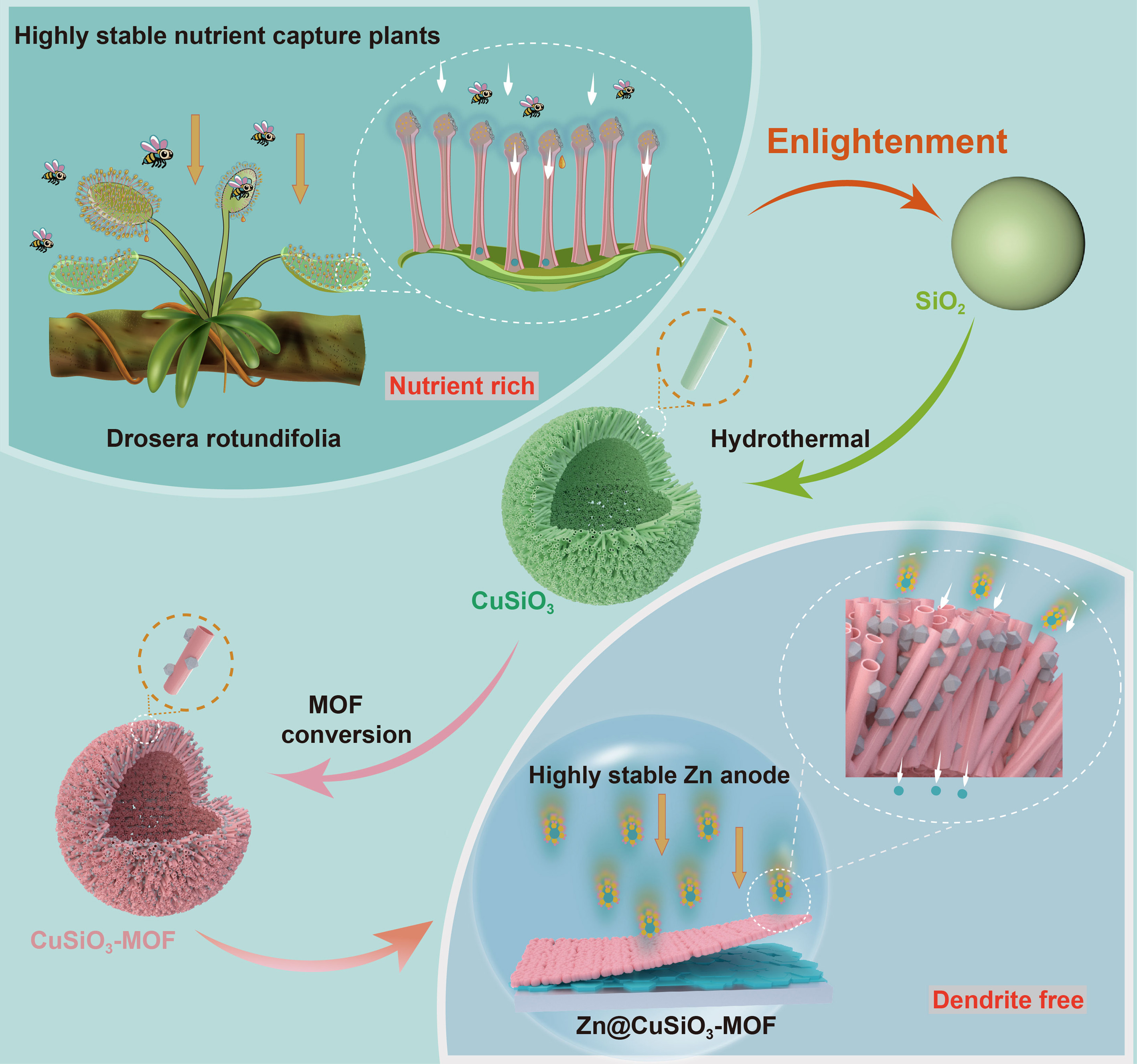 为解决这些挑战,球友会平台(中国)赵毅研究员团队从圆叶茅膏菜的生物机制和共生结构中汲取灵感,提出了一种原位MOF转化构建的分级中空CuSiO3-MOF杂化材料。这种仿生杂化材料作为锌负极人工保护层,可为锌负极提供优异的结构稳定性、丰富的亲锌位点、强大的去溶剂化能力和快速的离子迁移能力,从而实现高度稳定的无枝晶锌沉积/剥离过程,并有效抑制与水相关的副反应。在低电流密度下,Zn@CuSiO3-MOF对称电池展现出超过3500小时的超长循环寿命。即使在45%和90%的高放电深度下,该电池仍分别保持1200小时和400小时的稳定循环性能,显著优于大多数已报道的MOF修饰负极。此外,以MnO₂和C@V₂O₃为正极的全电池表现出卓越的循环性能和倍率性能,进一步凸显Zn@CuSiO3-MOF负极在电网储能和可穿戴电子设备中的实际应用潜力。这一仿生策略为构建稳定MOF基杂化材料用于高性能锌金属负极提供了一种可行的方法。研究成果以“A Biomimetic Copper Silicate-MOF Hybrid for Highly Stable Zn Metal Anode”为题,发表于材料顶级期刊《Advanced Materials》。