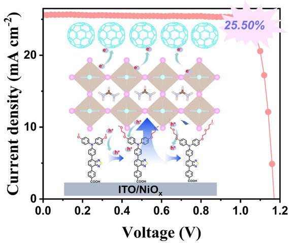 据此,球友会平台(中国)海峡柔性电子(未来科技)学院王漾教授、安明伟副教授、王越副教授以及张地伟讲师设计了基于给体-受体分子骨架的SAMs,并通过引入不同长度醚氧链调控分子的薄膜形貌与界面属性。研究发现,与模型分子MPA相比,醚氧链的增长可以显著提升NiOx表面的覆盖率和导电性。重要的是,具有较长醚氧链的分子(MEPA)可以促进钙钛矿薄膜的有序生长和高结晶度,并能调控钙钛矿上表面能级,使其更具N型特性,从而实现钙钛矿与电子传输层之间的良好能级匹配。因此,基于NiOx/MEPA的钙钛矿电池实现了高达25.50%的效率,并在ISOS-L-1条件下表现出优异的稳定性(1260小时后仍保持初始效率的90%)。本工作为设计高效界面材料从而实现自下而上调控钙钛矿结晶与表面能级提供了新思路。该项工作以“Bottom-Up Regulation of Perovskite Growth and Energetics via Oligoether Functionalized Self-Assembling Molecules for High-Performance Solar Cells”为题发表在国际顶级期刊Angewandte Chemie International Edition上。