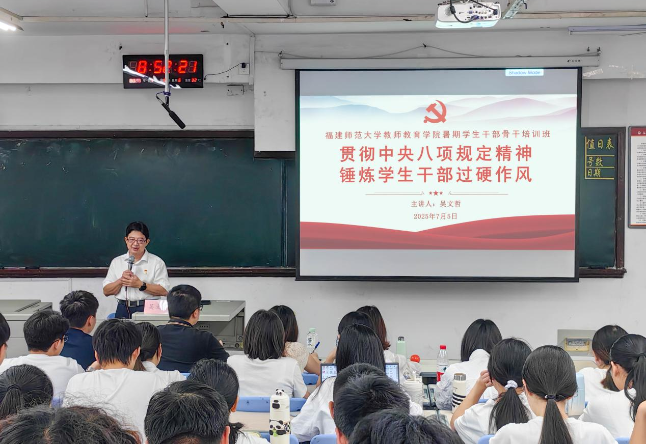 7月5日,教师教育学院院长吴文哲为学院学生干部骨干开展以“点燃青春之光 堪当时代重任”为主题的思政课。
