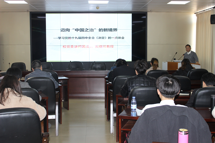 会上,黄晓辉教授紧紧围绕深入学习贯彻落实党的十九届四中全会精神这一主题,从《决定》的基本框架和主要精神、新中国国家治理的历史发展和基本经验、迈向“中国之治”的新境界三个方面,对中国特色社会主义制度和国家治理体系的显著优势、总体要求、总体目标和重点任务进行了系统解读,对学习贯彻全会精神、坚定制度自信谈了认识和体会,最后阐明了迈向“中国之治”新境界的含义。