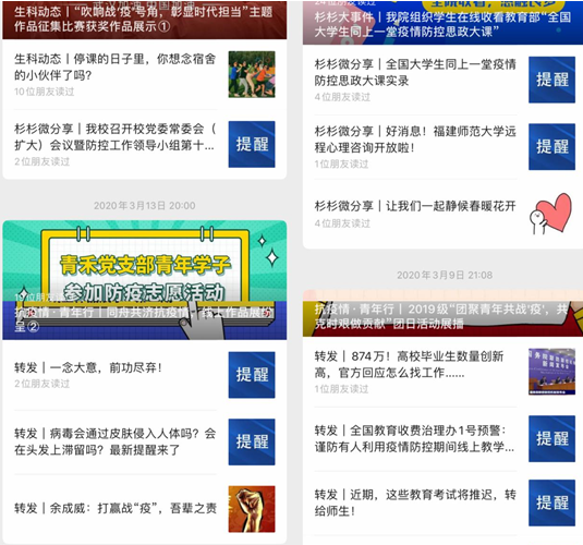 学院通过QQ群、微信公众号、微博、易班等新媒体平台,及时推送传播将疫情防控内容等,加强舆论引导,引导学生不信谣、不传谣、不造谣。其中,2018级生物科学第一团支部原创推文《我在福师大,听说樱花开了!》在“福师大小葵”头条推送,阅读量超7500;学院还制定了“共抗疫情、爱国力行”线上主题宣传教育活动实施方案》,持续推进学生思想政治教育。