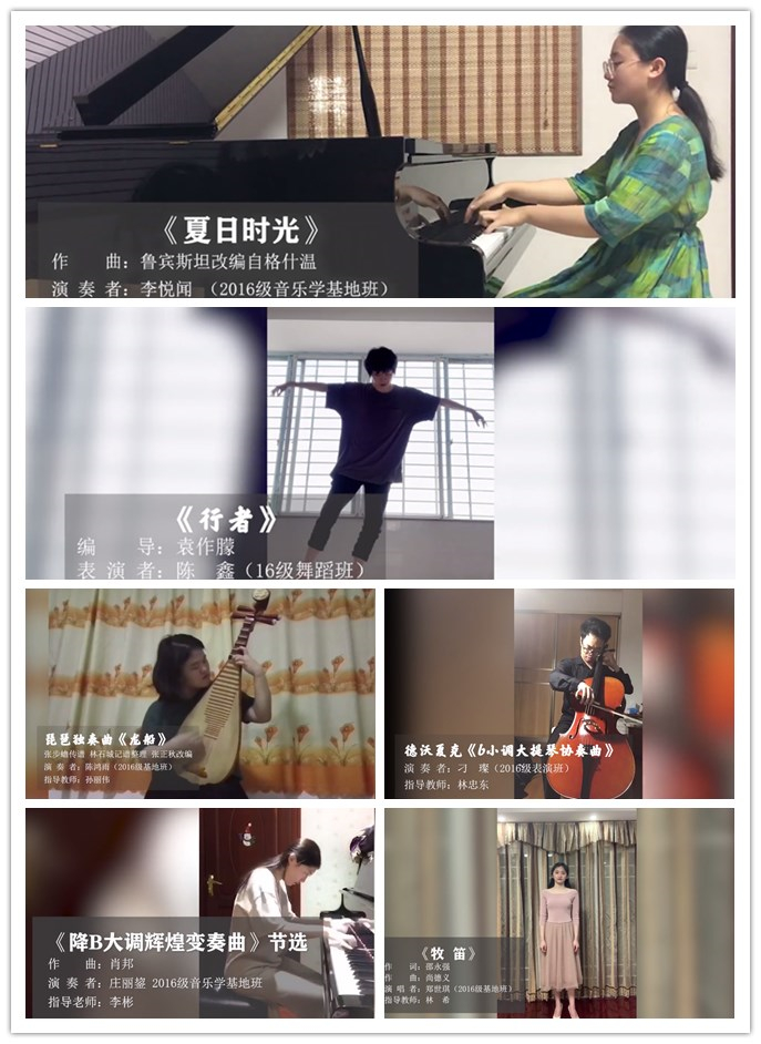 此次线上作品汇报展分为钢琴篇、声乐篇、管弦篇和舞蹈篇四个篇章,共24个作品。其中,钢琴作品包括《激流练习曲》《降B大调辉煌变奏曲》(节选)《肖邦八度练习曲op.25 no.10》等肖邦的经典曲目;声乐作品则以花腔女高音歌曲《玛依拉变奏曲》《牧笛》,民族声乐作品《昭君》为代表;中外管弦乐作品包括《b小调大提琴协奏曲》《e小调小提琴协奏曲》,古筝曲《定风波》《长相思》,二胡名曲《江南春色》以及琵琶独奏曲《龙船》;舞蹈作品涉及《行者》《孔雀东南飞》《红艳凝香》等蕴涵传统文化特色的剧目。