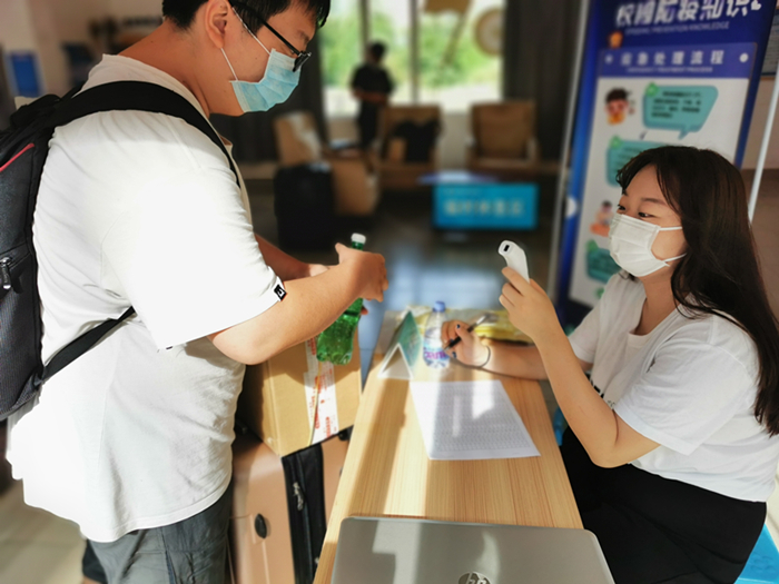 返校当天,学院辅导员、学生志愿者在宿舍楼严格按照流程,为返校学生逐一进行身份核验、体温检测,并提醒告知有关注意事项。现场井然有序、规范严谨。