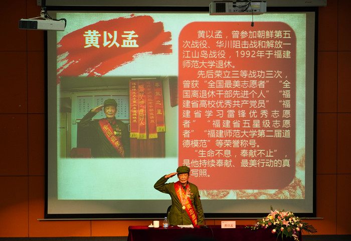 1028日,外国语学院邀请抗美援朝老英雄、全国最美志愿者黄以孟做客学院“博闻讲堂”,为师生上学习“四史”主题教育课。校关工委主任许歌平、副主任郭警修,院领导章琳、李启辉、林志达,教工党支部教师、辅导员,及2020级新生参加了活动。