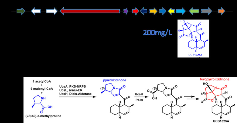 The search for natural active product has always been an important research field in drug development. Byusing genome mining, Li Li et al. discovered from Myceliophthora thermophilaa natural product UCS1025A that hasnovel complex trijunction heterocycle structure and strong anti-tumor activity (by inhibiting telomerase activity). Their discoveryhas not only revealed the biosynthetic mechanisms and pathways of UCS1025A at the genetics and biochemistry level and but also achieved efficient expression of UCS1025A in heterologous hosts through genetic engineering techniques.