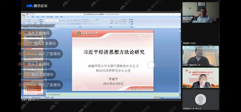 On November 6, the 2nd Forum on Political Economy of Socialism with Chinese Characteristics (PESCC) for a New Era was held. The conference was hosted by the seven key supported National Research Centers for PESCC by the Publicity Department of the CPC Central Committee, and co-organized by the National Research Center for PESCC of Southwestern University of Finance and Economics (SWUFE) and other units. The conference was held in the form of Tencent meeting and online live broadcast. Professor Li Jianping, chief expert of “the Marxist Theory Research and Construction Project” of the CPC Central Committee, a well-known Marxist economist in China, former president of FNU, and director of the National Research Center for PESCC of FNU, was invited to attend the conference and gave a keynote speech.