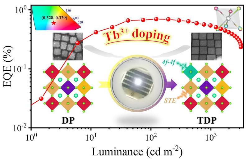 To address the concerns, Professor Chen Daqin’s research team employed Tb (terbium) doping and a host-guest strategy, achieving an improvement in CE (current efficiency) of EL devices from 0.110 cd A-1 to 0.634 cd A-1, EQE from 0.08% to 0.76%, and luminance from 158 cd m-2 to 2793 cd m-2. The improvement is attributed to the inhibited formation of metallic Ag nanoparticles, the confined spatial distribution of STEs (self-trapped excitons), and the reduction in local site symmetry by Tb doping, and the host-guest strategy improved film morphology, reduced defect density and increased carrier mobility. Besides, pure white electroluminance with ideal color coordinates of (0.328, 0.329) and a record-breaking optoelectronic performance was achieved by introducing additional green carbon dots in light-emitting diodes (LEDs) to fill the deficient green component.
