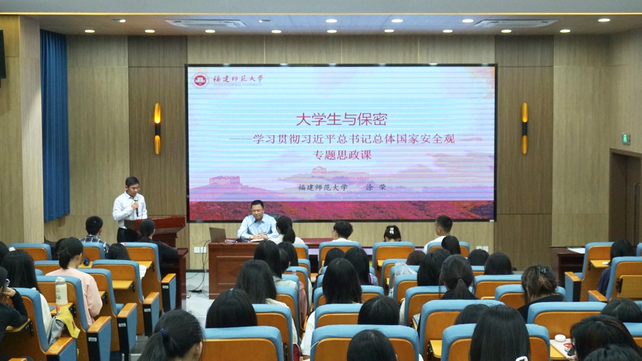 上好一堂保密课,将保密教育融入育人体系。5月16日,校党委副书记涂荣为马克思主义学院2023级全体同学讲授《大学生与保密——学习贯彻习近平总书记总体国家安全观》专题思政课。大学生普法志愿者团队为福州达明小学、王庄街道等地师生群众开设趣味保密课。各学院将保密教育融入周末集中教育、主题班会课等,实现保密教育无死角、全覆盖。